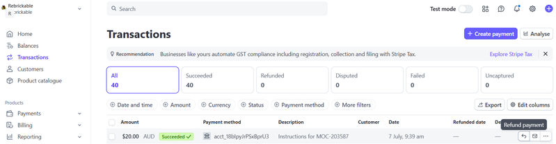 This will send the payment back to Rebrickable, which will automatically send the payment back to the customer, cancel your commission and block access to the instructions. Please ignore the info message. Depending on what your balance is in stripe, you may need to transfer funds into Stripe before it will allow you to process the refund.