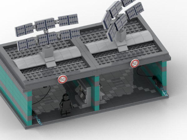 Design created for vehicles larger than 6 studs wide and for taller cars. The car wash includes two rotating solar panels, fully functional. The wash guns are mounted on movable booms allowing walk around car with gun in minifig's hand. Two types of guns are available: one for water and one for foam.