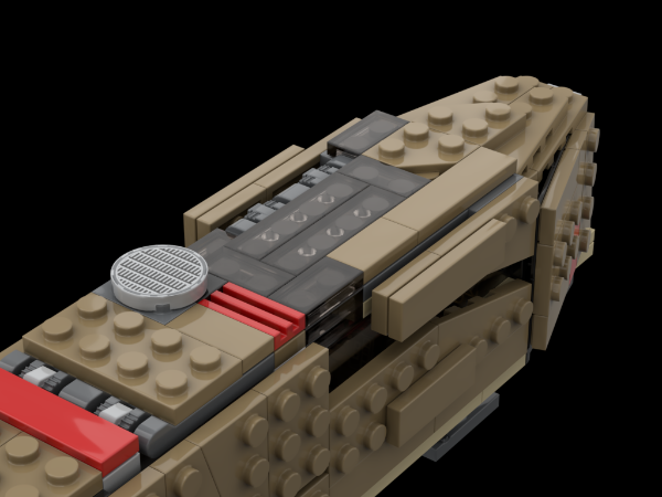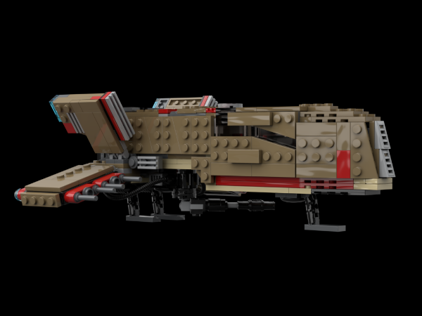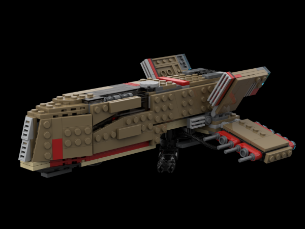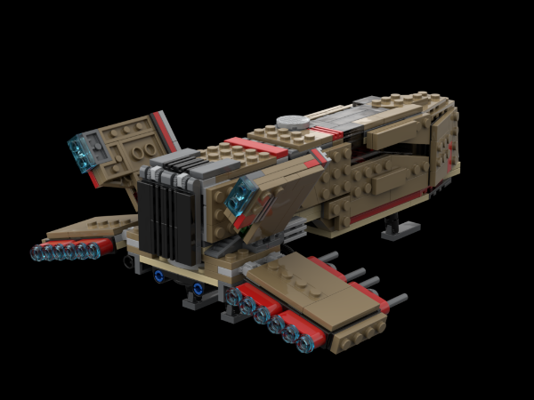 Hello Star Wars Lego fan and welcome to my fifth premium MOC submission! The Dark Forces Video game Moldy Crow in midi scale! Also known as Kyle Katarn and Jan Or's personal Starfighter. I have held a special place in my heart for this ship ever since playing the Dark Forces games 20 years ago and this is the 4th version I have created. The first version was really rough and used early 2000s pieces. My second version was much bigger and more accurate, taking advantage of relatively new dark red pieces. My third version was equally as big and refined, with modern shades of brown bricks. However, I felt the model was too large and I like the midi scale, so here we are today :). Features of this MOC: opening cockpit that seats two minifigure, detailed interior with control panels and a seat, small front and rear landing gear (retractable) that helps present the model, small medical bed and storage compartment behind the pilots, opening roofs and rear hatch, accurate angles and slopes which better represent the source material. Flexible wings and tail fins. Rotating belly blaster cannons. Finally, the model is HIGHLY swooshable and very stable! I also think it pairs well with existing Lego SW sets. This model will fit in many hangars and bases, just like the video games.