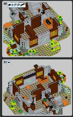 Step 50 and 51 need review. Step 50 shows to place 2 1x2 lbg snot and 1 1x2 mason brick (4 exposed side studs) Step 51 shows to attach 6 clips to that same section but only 4 studs available instead of 6.