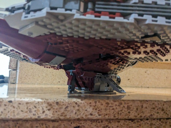 The wings can fully rotate around the ship with enough resistance from gears to keep it in whatever position it's set at. With the heavy weight, there is a bit of bowing in the wings and main body, but it is very miniscule and doesn't affect the build. It is all sturdy enough to pass a swoosh-ability test.