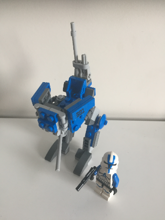 This is a downsize of the way too big AT-RT from 2013 (75002). It only uses the parts from the original AT-RT so you can keep you sniper droideka built. The build holds one minifigure and their blaster.
