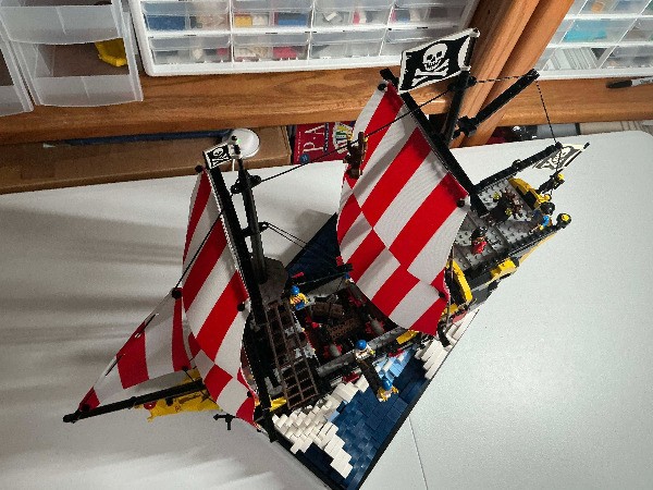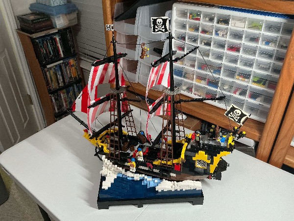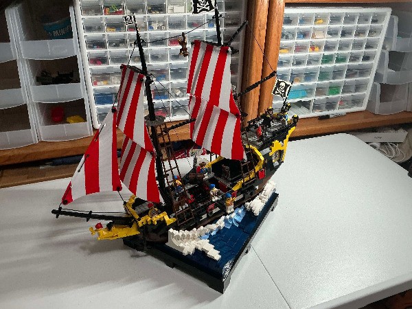 Here's how mine came out ... i'm liking how it holds the ship tipped forward and to one side as it appears to be crashing over 1 wave into another ... brings it to life very vibrantly. The instructions were reasonably easy to read. I think i found 1 or 2 steps where parts were added twice but other than that no issues there. I can confirm that you can use any color bricks you have to replace the dark bluish gray ones as they are not visible at all. I used them simply cuz i had them already.