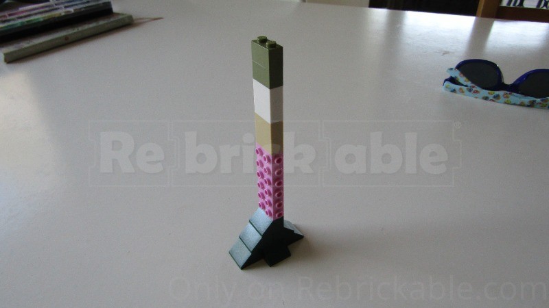 So the model itself can be put in a variety of positions, while I'll admit it can be tricky to balance, since I was not allowed the luxury of lightening the skull like Azhdarchids do IRL, you have to be careful how you pose 'im. However you may note from the thumbnail that it is indeed possible to put the model in quite a dynamic position, though you may need to utilise the spare parts to stop the one forelimb supporting most of the weight to slump down: just attach the curve here to stop your forelimb slipping! It is easier to just have all four legs on the ground instead of two though. You can also pose the model flying, like in the renders (no flying pics outside this time, sorry guys), and if you have a relatively new set with strong joints, you can fully outstretch the wings with no need for supports. However, if supports are required you can always add some on like so: Another note for flying poses: the lovely neck skin may not look so lovely when there's a weird corner just sort of floating when you tilt the head upwards, so you can modify it by removing the 1x2 brick and replacing the 1x3 slope: If you can't attach the model to a string or something to hang it up, you can always assemble a stand from the spare parts: