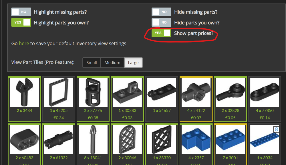Hello, the inventory in Rebrickable has the options to show the price. And each singular part has is individual page to show the volume pof production and availability. I usually use this function to control the cost.