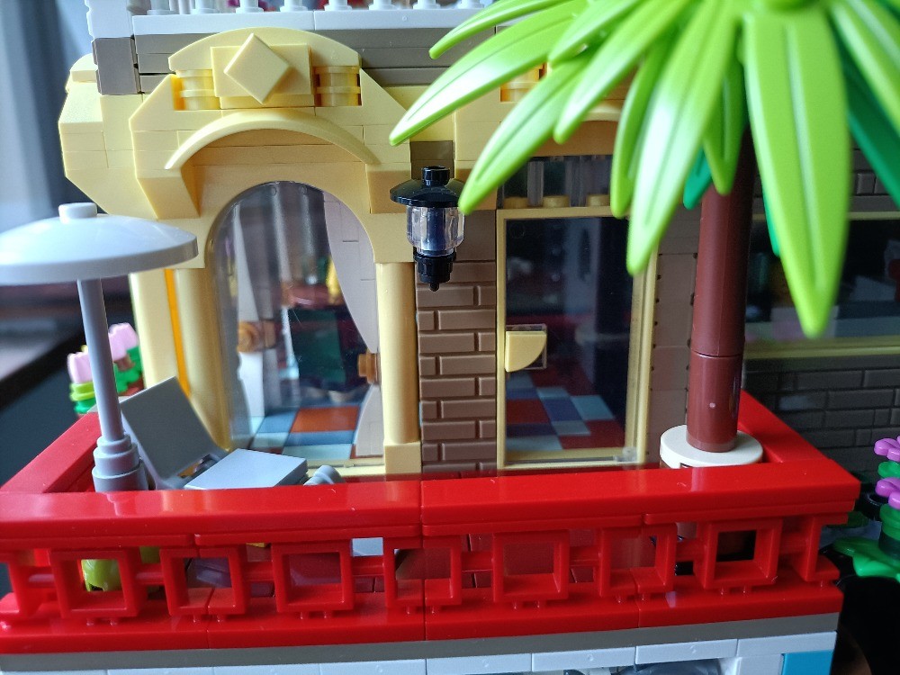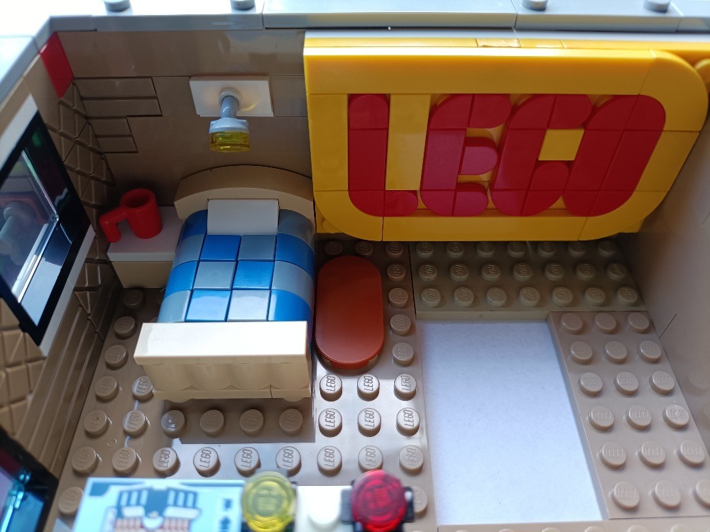 Use the internal stairs to get into second level! Here there is the bedroom with a small bathroom and a large LEGO poster on the wall. The guys who lives here was lucky enough to have space in his room to build his own LEGO city diorama just in front of the bed! A large solarium surrounds the second level equipped with another deck chair and a water pump for the flowers outside. Finally, there are 2 big billboards on the roof promoting this new Fish Shop!