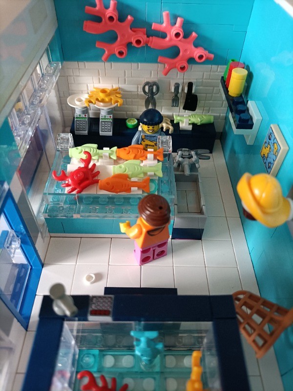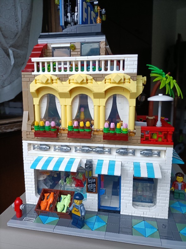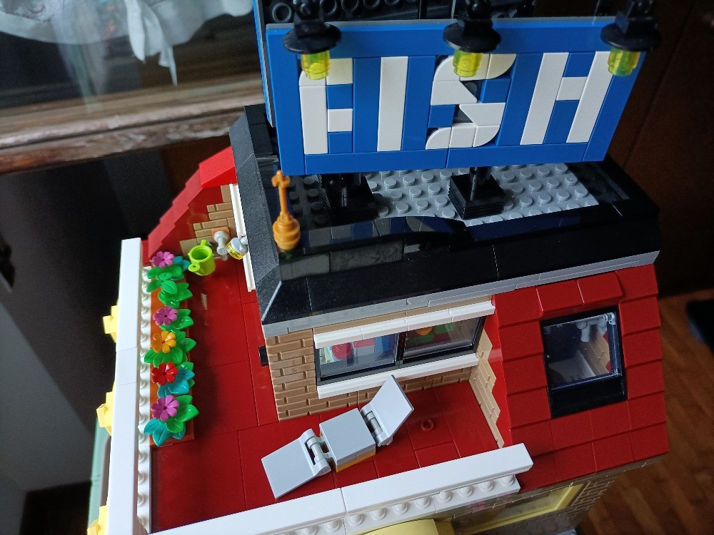 My new MOC! The Corner Fish Shop with a cozy apartment This is a corner modular building and can be a nice and useful addition to your LEGO City/Modular buildings. You can place it near your beach area and/or harbor. The Moc is divided into 3 levels placed on classical 32x32 baseplates and you can use it as a colorfully building to make a corner among the other buildings.