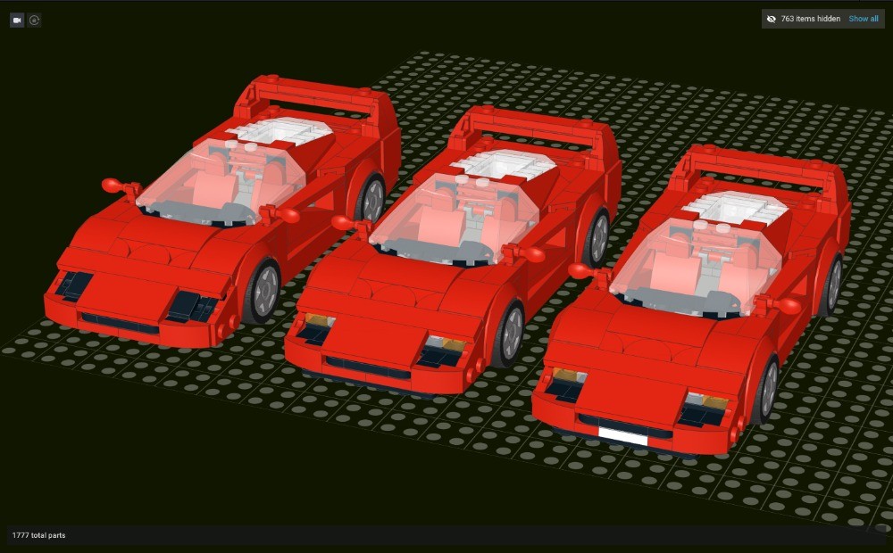 Just some minor modifications to the set. You will need 72 extra parts. I left the headlights untouched. This is the most annoying part of the model and I've tried multiple ideas, but the original is still the best version. The second best solution would be to use one cheese slope and 2 2x2 wedge plates for each headlight, but the sides still stick out half a plate which were just uneasy for my eyes. You can see my try on it along with an optional licence plate modification below: The front grille is slightly different. It looks more accurate from certain angles. The sides are identical to the set. The bottom is very inaccurate and it can be improved, but that way it doesn't line up with the front which just looks wrong. The air intake has a too steep angle, but I couldn't find a better piece. A 3x1x2 slope would be perfect here. You can still see through the doors, I added two extra plates to make it less severe. The interior has some improvements as well. If I were to recreate the model from scratch, i would've made the dashboard DBG, but one of the parts are stickered and the steering wheel is black, so the hue remained unchanged. I didn't bother with the engine, you couldn't see much of it anyway. I think the windscreen is good enough at this scale. The rear spoiler looks much better this way, but still not perfect. It's too high and the logo is missing. The rear is the same. The black area should be smaller below the lights and the bottom should be higher. I couldn't figure out how to fix it. There are some minor added details as well, most notably the random colored parts that stick out have been changed to neutral colors. I included a helmet in the inventory, this should have been included in the set to fit the minifig inside. The inventory reflects the digital model.