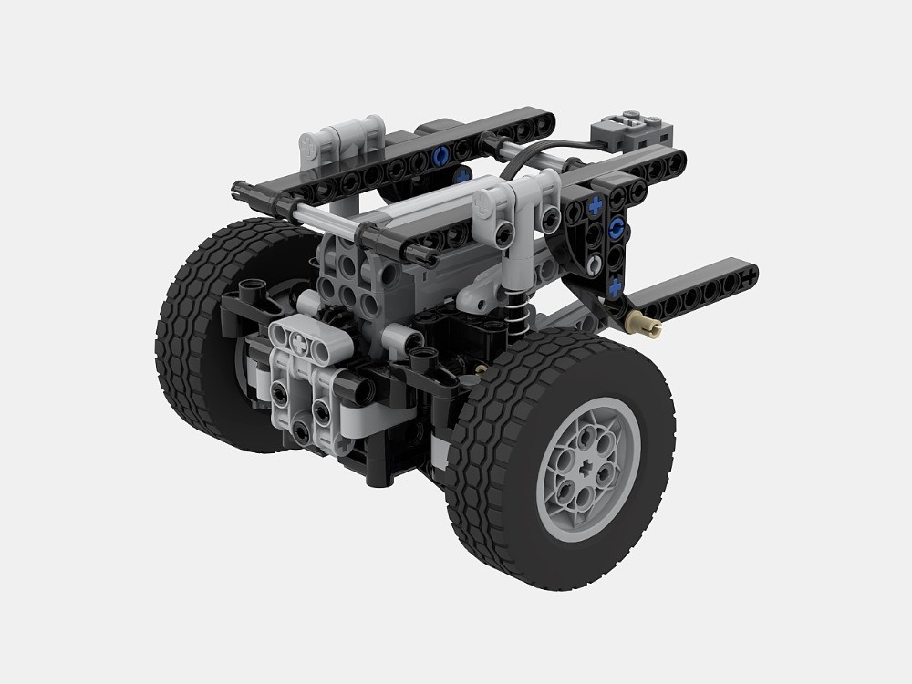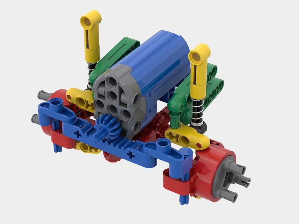 Specs : - Onboard PF Servo Motor Version (Control+ Version here) - 11-stud width (knuckle to knuckle), 13cm wide with 62.4mm wheel - Geared hub + CV-join (only two needed, other are standard CV-Join) - Inclined underneath suspensions arms (can be considered as illegal but give better ground clearance and differential secured) - Equipped with a 28t simple bevel differential, NOT compatible with red 28t of yellow 22t crown - Steering with rack and pinion, 4 studs distance from the knuckle axis to use 180° of rotation of the Servo motor without forcing on axle end stops - Suspended with 4 links (2+2 lateral) + 2 springs with lateral movement constricted (can be replaced by harder if needed), no need of Panhard rod but you can add one for better stability - Simple chassis for suspension mounting included - Free instructions with 3D model (Ldraw and Stud.io) for building convenience (authorized commercial use if credits)