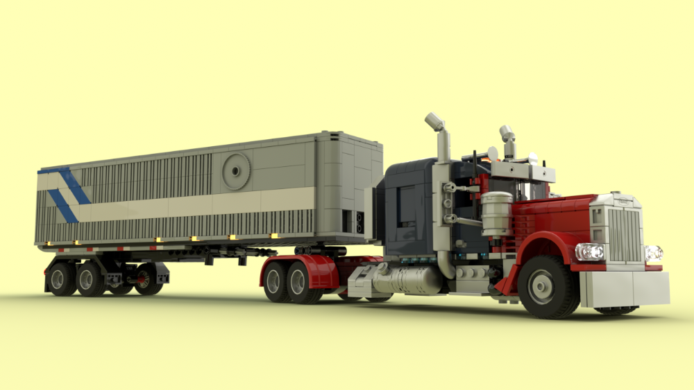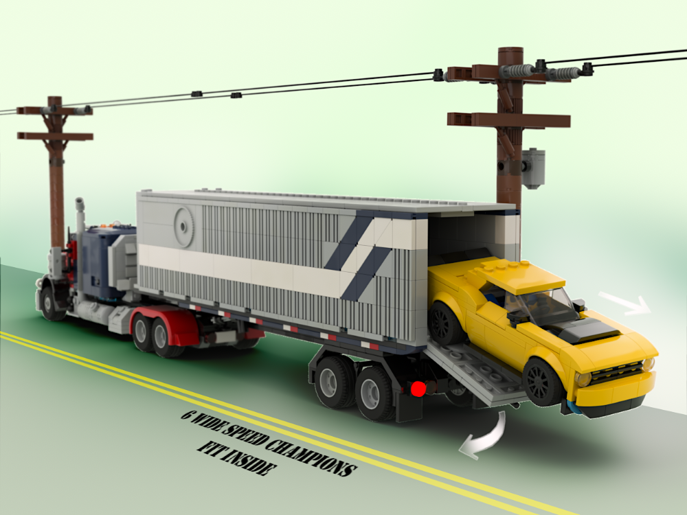 Welcome to the pairing for MOC230312, the movie favorite Optimus Prime! This moc builds Optimus' trailer with an opening rear door for 6w Speed Champion cars to fit and jump out of! Build this to pair with the Optimus Peterbilt truck or customize and pair with any of my other semi trucks!! above: speed champion car jumping out rear of trailer (car and truck cab built separately)