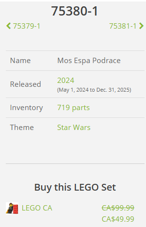SELECT "lego_baseset"."id", "lego_baseset"."set_num", "lego_baseset"."name", "lego_baseset"."year", "lego_baseset"."theme_id", "lego_baseset"."set_type", "lego_baseset"."num_parts", "lego_baseset"."default_inventory_id", "lego_baseset"."is_active", "lego_baseset"."is_accessory", "lego_baseset"."added_dt", "lego_baseset"."added_by_id", "lego_baseset"."last_modified_dt", "lego_baseset"."last_modified_by_id", "lego_baseset"."last_checked_for_bi", "lego_baseset"."descr", "lego_baseset"."primary_photo_id", "lego_baseset"."is_gear", "lego_baseset"."is_book", "lego_baseset"."search_vector", "lego_baseset"."mfhash_vector" FROM "lego_baseset" WHERE "lego_baseset"."set_num" = '75380-1' LIMIT 21SELECT ••• FROM "lego_baseset" WHERE "lego_baseset"."set_num" = '75380-1' LIMIT 21