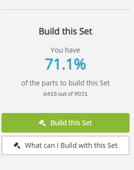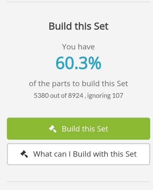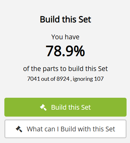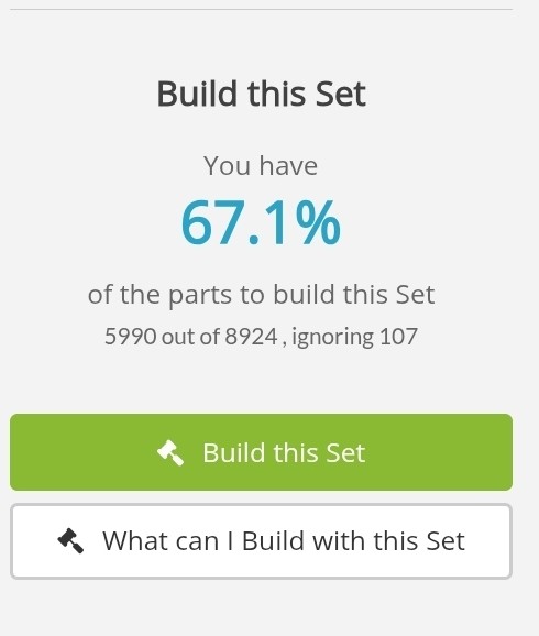 My 'social activity level' here is not high enough yet to post a comment including a screenshot (of course I tried), but ReBrickable says I have 96,4% of the parts to build this set. (And that is with all the parts in the right color of course) 8705 out of 9031 parts... I don't think I will ever buy this Death Slice, certainly never at full RRP!