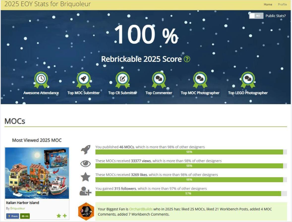 First, the profile was rewarded with multiple badges and a perfect score representing how well it used Rebrickable's features in 2025. A special thanks to OrchardBuilds for being my biggest fan/supporter throughout the first year on the site. He has not been online for a while, hope everything is fine: thanks for your cheers and mentorship buddy!