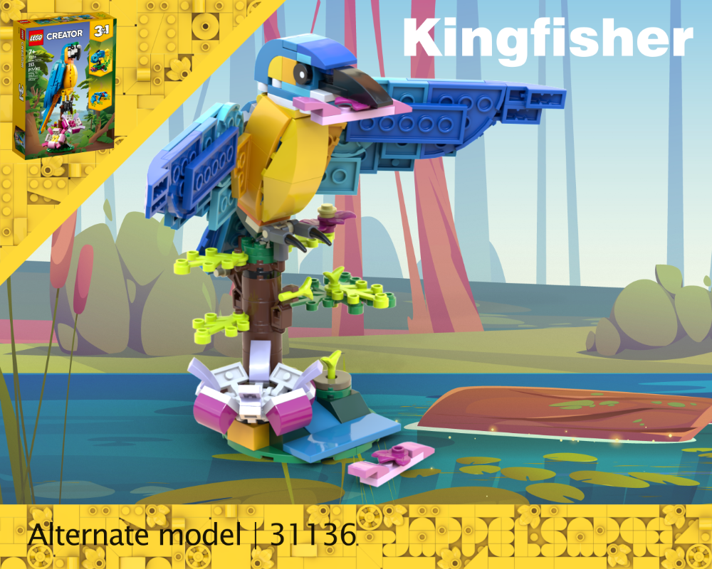 I decided to make a kingfisher, as it has the perfect colour scheme for it and the belly was also already perfect for it. I was actually quite surprised that there wasn't already a kingfisher alternate build for this set.